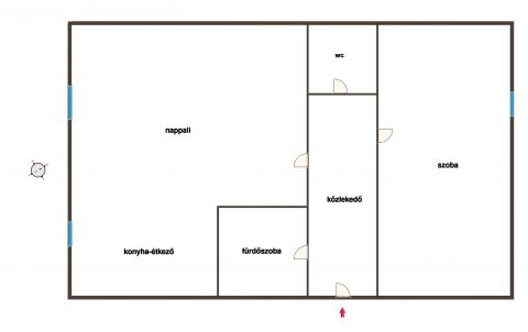 Előszoba, közlekedő, amerikai konyhás nappali étkezővel, 1 fél szoba, fürdőszoba, wc külön.