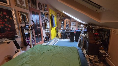 Tetőtér jellege egyedül a hálószobában érződik, a többi helyen ki van emelve a lakás.