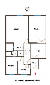 Az előszobából nyílik a hall, amelyből az egyik szoba megközelíthető. Ugyanebből nyílik a közlekedő,