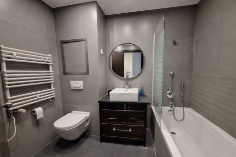 A fürdőszoba modern kialakítású, mosógéppel felszerelt, hajszárító is rendelkezésre áll a leendő bérlő kényelméért.