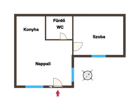 A lakás jól átgondolt, praktikus elrendezésű és világos. A tágas amerikai konyhás nappali kényelmes központi életteret biztosít, mellette külön nyíló hálószoba található. A fürdőszoba wc-vel felszerelt, kialakítása és anyaghasználata minőségi megoldásokat tükröz.