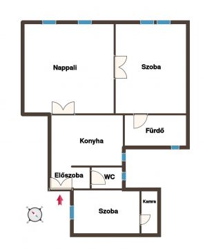 A lakásban két szoba és egy tágas, világos nappali található, amely barátságos, otthonos hangulatot áraszt.