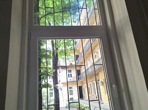 A nappali csendes utcára néz, a háló egy nyugodt belső udvarra, ahol egy öreg gesztenyefa teremti meg a különleges hangulatot.