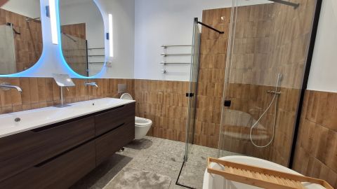 A magas minőségi kivitelezés, stukkók, és design lámpatestek mind egy egyedien elegáns hangulatot kölcsönöznek a lakásnak.