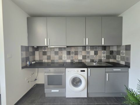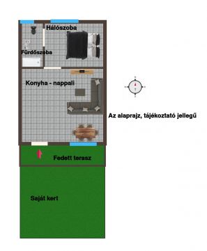 A lakás praktikus elrendezésű. Előszoba beépített szekrénnyel, amerikai konyhás nappali, beépített modern konyhabútorral. A nappaliból a hálószoba érhető el. A fürdőszoba zuhanyzós, villanybojlerrel felszerelt.
