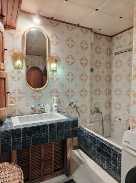 A lakás egyedi hangulatát a ferde mennyezeti síkokkal tagolt, különleges belső tér, valamint a csendes, intim hangulatú, zöld kertre néző terasz adja, amely tökéletes helyszíne lehet a reggeli kávéknak és az esti kikapcsolódásnak.