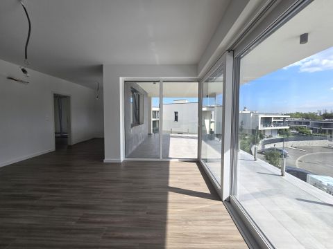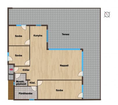 Az ingatlan valódi különlegessége a közel 50 m²-es  terasz, amely szinte teljesen körülöleli a lakást. A nappaliban kialakított nagyméretű, modern tolóajtók révén a belső tér és a terasz szinte egybefolyik, így a természetes fény akadálytalanul áramlik be, a nappali pedig egész nap napfényes. Ez a tágas tér nemcsak a mindennapok központja, hanem tökéletes helyszín baráti összejövetelekhez, családi pillanatokhoz vagy egy nyugodt esti kikapcsolódáshoz.