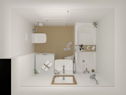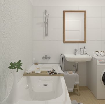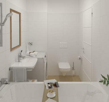 A lakás fehér tónusú burkolatokkal készül, amelyek elegáns, letisztult alapot biztosítanak bármilyen belső stílus kialakításához.
