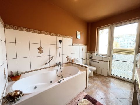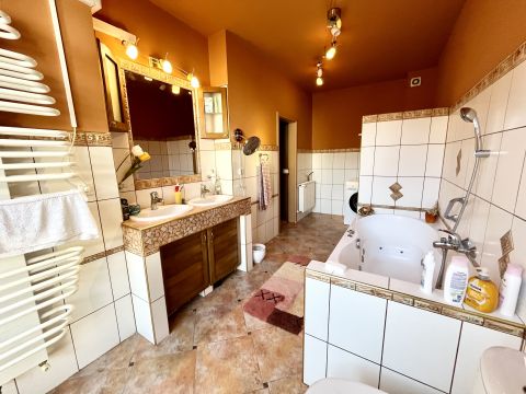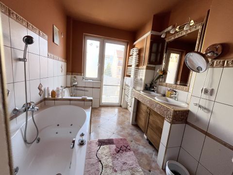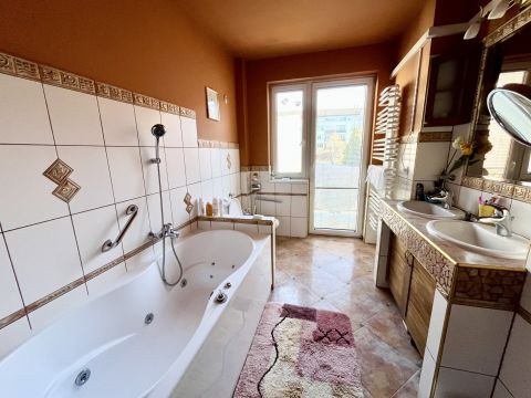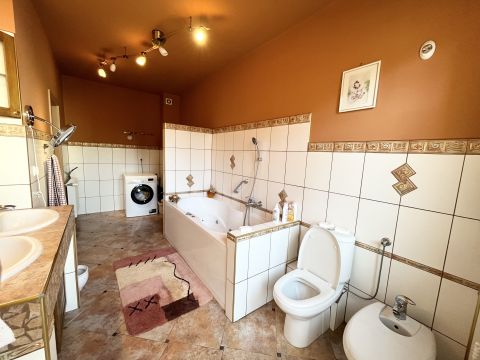 A fürdőszoba rendkívül tágas és világos, igényesen kialakított.
