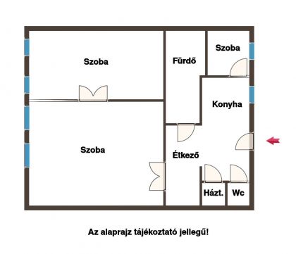Konyha-étkező, nappali, nagy méretű hálószoba, félszoba, fürdő-wc és külön wc alkotják a lakás tereit. A nappali és a háló utcai, a félszoba udvari tájolású.