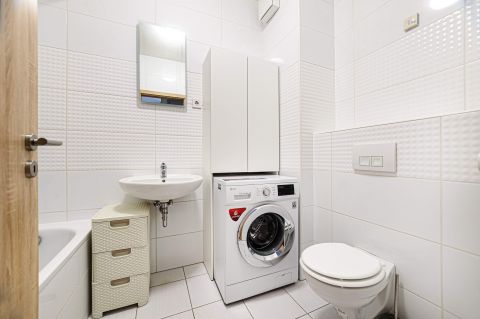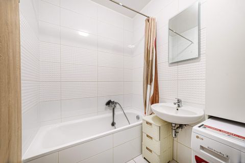 Lakás helységei: Előszobába lépünk be, innét jobbra nyílik a fürdő WC-vel. Itt van a mosógép is. A fürdőben kád van.