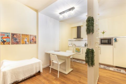 This stylish home features a spacious living room with an open-plan kitchen, facing a quiet inner courtyard offering peace and tranquility right in the city center.