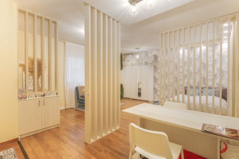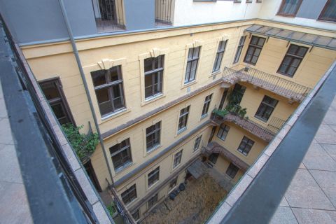 A lakás nagy, világos amerikai konyhás nappalival rendelkezik, csendes belső udvarra néz, így a belváros nyüzsgése mellett is tökéletes nyugalmat biztosít.