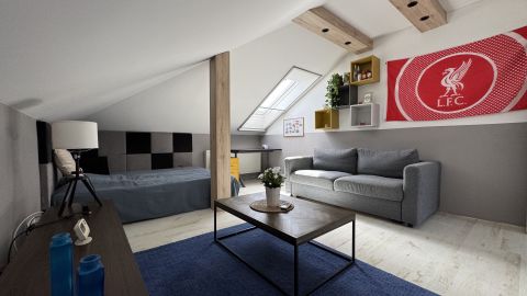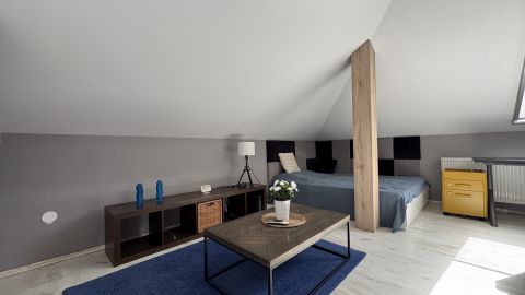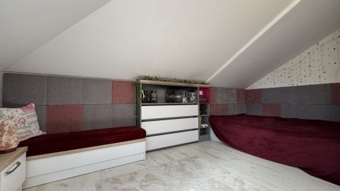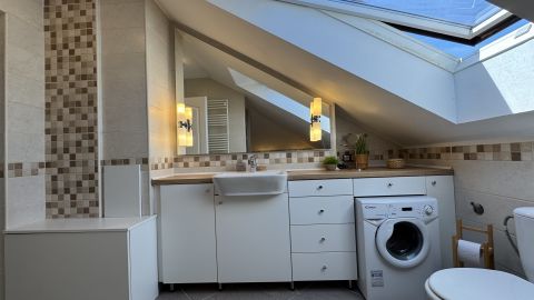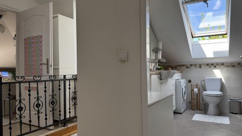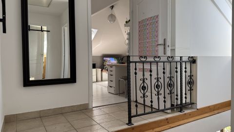 A lakás egyik legnagyobb előnye a jól elkülönített kétszintes kialakítás, amely ideális családok számára. Az alsó szinten találhatóak a közösségi terek és a szülői zóna, míg a felső szint teljes értékű, szeparált életteret biztosít a gyermekek számára, külön szobákkal és saját fürdővel.