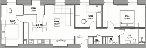 Nappali-konyha + 3 külön nyíló hálószoba