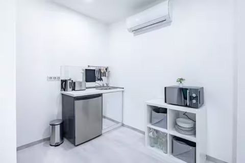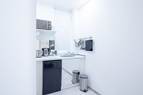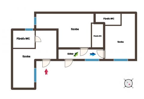 Az ingatlan egy lift nélküli társasház 1 emeletén helyezkedik el. Az elosztása kiváló, áll három külön nyíló lakrészből, valamint egy közös előtérből, amiből az 1. és a 2. lakrészek nyílnak. A külön lakrészek elrendezése azonos, egy szobából konyhasarokkal és külön fürdő+WC-ből állnak. A fűtéshez és a meleg víz ellátáshoz mindegyik lakrészhez külön hűtő-fűtő klíma, valamint villanybojler áll rendelkezésre. Az ingatlanban H tarifás áramszolgáltatás van használatban.