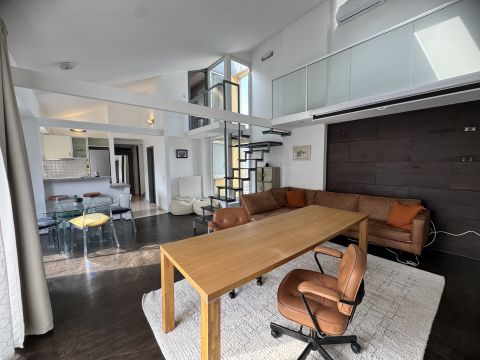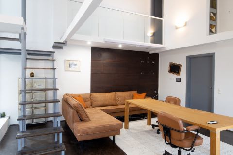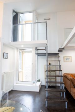 The apartment features spacious, bright interiors, high ceilings, and a modern design. The floating staircase and gallery level give the home a distinctive character, while the carefully selected furnishings create an elegant yet welcoming atmosphere.