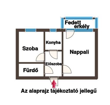 A bejárati ajtó előtt biztonsági rács található, amelyen keresztül haladva közelíthetjük meg a lakást. 35 nm-es alapterületén egy erkély kapcsolatos, DK-i tájolású nappali, a konyha, a 7 nm-es félszoba, valamint a fürdő+WC helyiség kapott helyet.