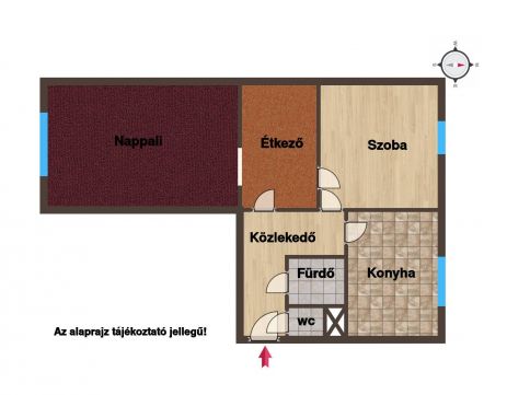 Az ingatlan elosztása: nappali, étkező, szoba, konyha, fürdő és külön WC.