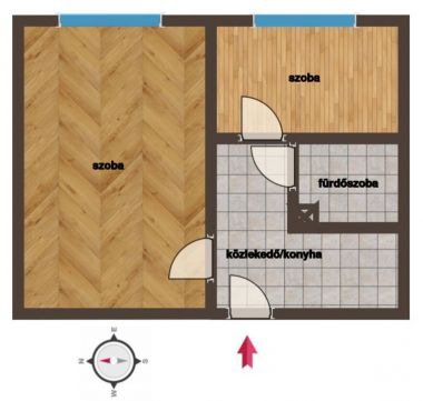 A szobákban parketta, a konyhában és a fürdőben pedig járólap és kőburkolat található.