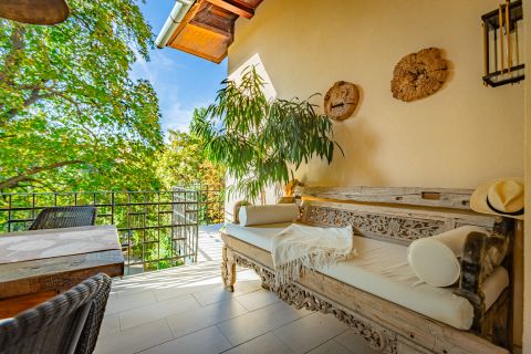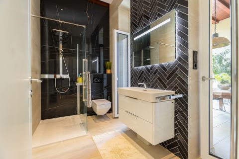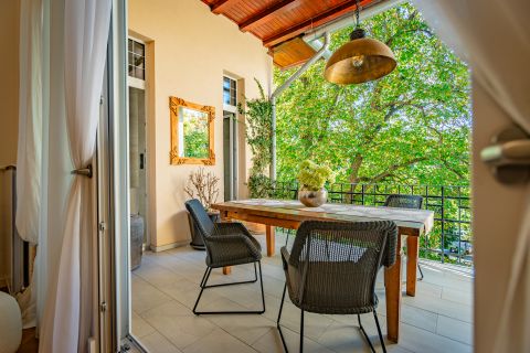 A lakás különlegessége a közel 26 m²-es, fedett, kertre néző terasz, amely nyugodt, zöld környezetre tekint.