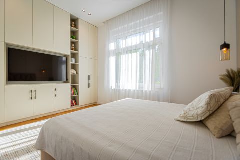 A tágas, nagy belmagasságú terek kiváló térérzetet biztosítanak, a lakás elrendezése átgondolt, jól élhető.