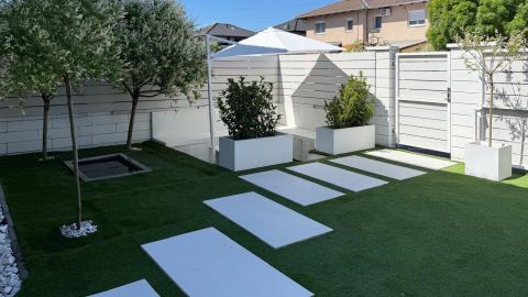 Ízlésesen kialakított kert kerti tóval és süllyesztett kiülővel