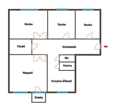 Az ingatlan elrendezése ideális: három különnyíló szoba, tágas nappali, konyha étkezővel, külön WC, fürdőszoba, valamint kamra is megtalálható benne.