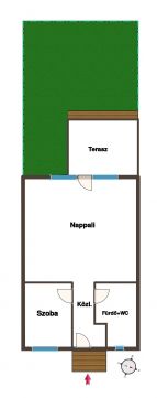 Elosztás: amerikai konyha + nappali, 1 hálószoba, fürdőszoba,