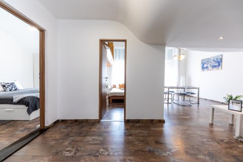 Egy 43 m²-es, és egy 86 m²-es önálló lakásként funkcionál, külön bejárattal, jól elkülöníthető terekkel.