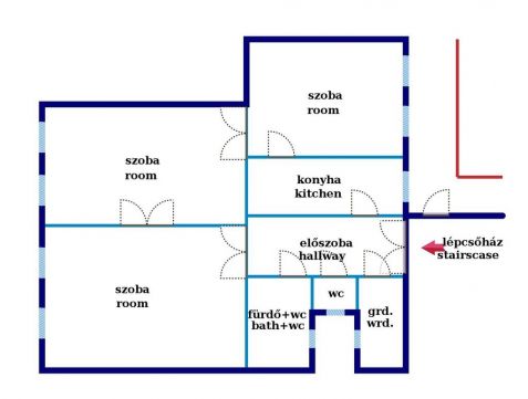 Az ingatlan közvetelenül a lépcsőházból nyílik, konyhája és kisebbik hálója néz az udvar felé.
