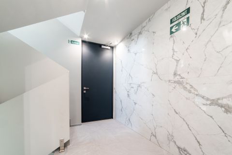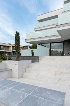 Épület külső homlokzatán, lépcsőházban és a teraszokon szintén nagyméretű Cesare Ceramica lapok vannak elhelyezve, a terasz burkolatba résfolyóka került elhelyezésre az üvegkorláton belül. Teraszok vízszigetelése Sika Fóliával, terv szerinti hőszigetelés vakum panellel és PIR hőszigetelő táblákból lett kiépítve. Fűtöttek, áram és víz van, minden teraszra jakuzzi telepíthető, előkészítése megtörtént.