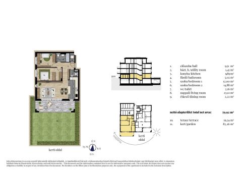 Újépítésű, háromszintes prémium társasházban kínálunk eladásra egy 80 m²-es, tágas elrendezésű nappali+2 szobás, duplakomfortos, háztartási helyiséggel rendelkező lakást, amelyhez 19 m²-es fedett terasz és 83 m² privát kert (a kert igény esetén bővíthető) tartozik. Teremgarázs, felszíni parkoló, tároló megvételére felár ellenében van lehetőség.
