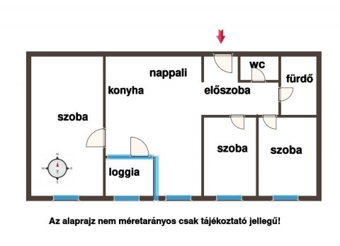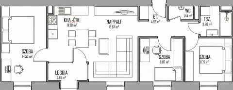 Nappali-konyha + 3 külön nyíló hálószoba
