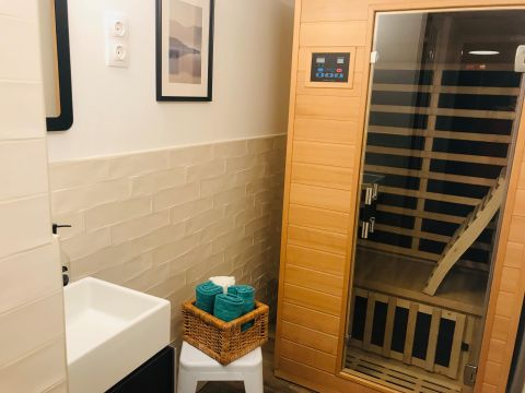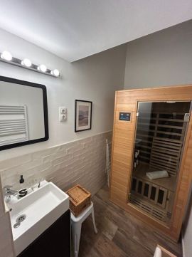 The apartment is furnished, equipped, and fully outfitted. Additional amenities include a separate toilet and a sauna with a shower.