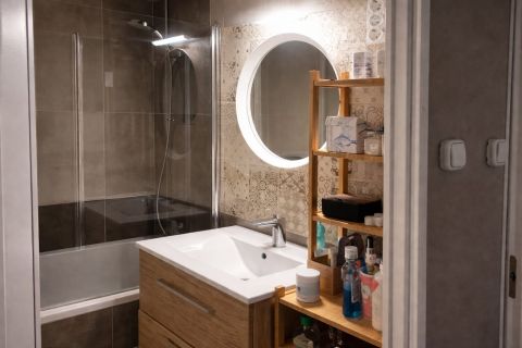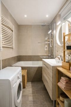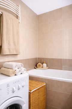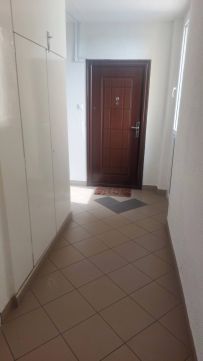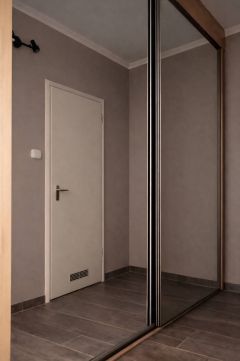 A folyosón jobbra egy üveges, beépített gardróbszekrény kapott helyet, ezzel szemben pedig a fürdő és a WC található, amelyek külön helyiségben helyezkednek el.