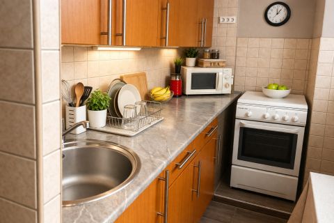 Jobbra haladva a közlekedőből nyílik a konyha és a háztartási helyiség.