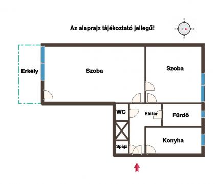 A lakásban két szoba, konyha, külön fürdő mellékhelyiséggel és egy kis kamra található. A nagyobbik szobához erkély tartozik.