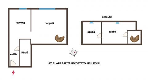Az előszobából nyílik a sarokkádas fürdő, a konyha, s ez után a tágas, panorámás kilátással büszkélkedő nappali is. Csigalépcsőn juthatunk fel a legfelső szintre, ahol két szoba kapott helyet. A belső két szintnek köszönhetően a nappali és a hálószobák jól elkülönülnek egymástól, így biztosított a nyugodt pihenés.