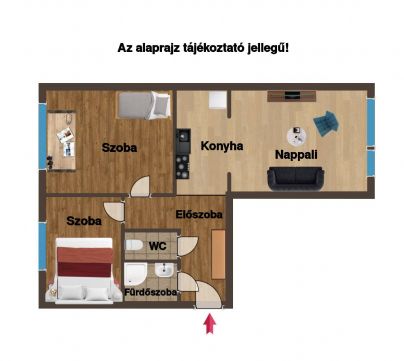 Az ingatlanban található: előszoba, fürdőszoba, külön WC, amerikai konyhás nappali és két hálószoba.