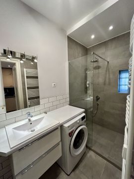 The bedroom is calm and well-separated, ideal for relaxation. The kitchen is equipped with modern appliances and has a practical layout, while the bathroom is nicely designed and fully renovated.