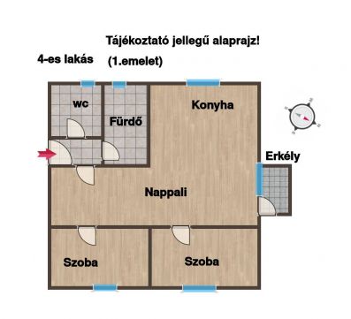 A 4-es lakás amerikai konyha és két hálószoba, erkély elosztású, tároló tartozik hozzá.