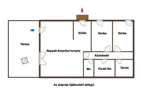 A helyiségeket tekintve nappali-amerikai konyha és két hálószoba, külön fürdőszoba és Wc elrendezésű az ingatlan.