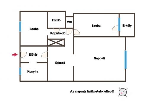 Az ingatlanban előtér, tágas nappali, konyha, étkező, 2 hálószoba, wc, fürdőszoba, valamint egy erkély került kialakításra.