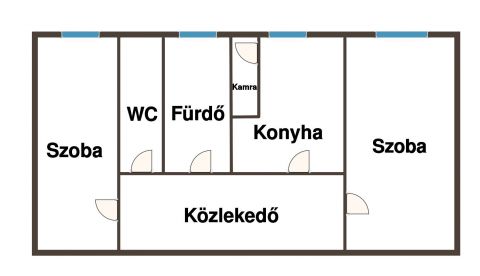 Az ingatlan elrendezése praktikus: egy nagyobb és egy kisebb szoba,  konyha kamrával fürdőszoba, különálló WC.