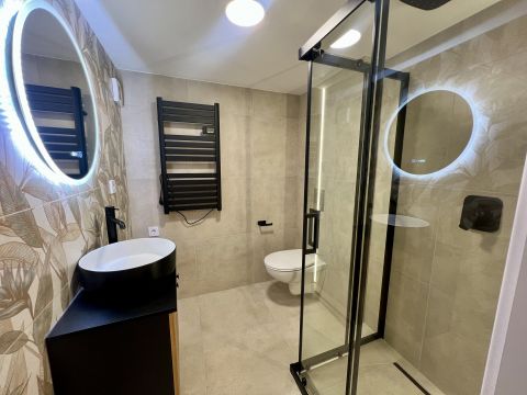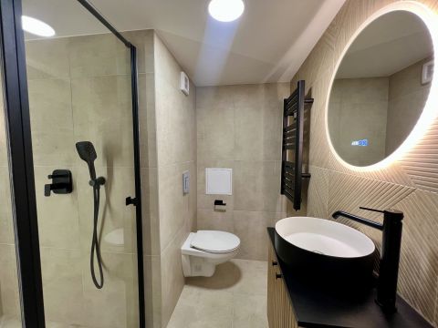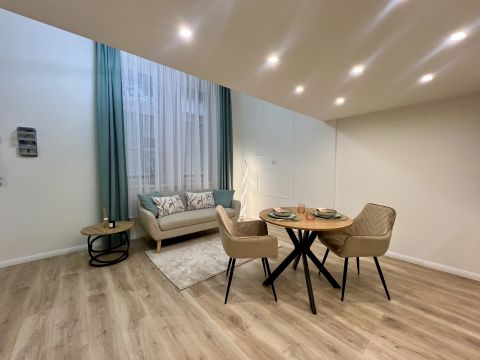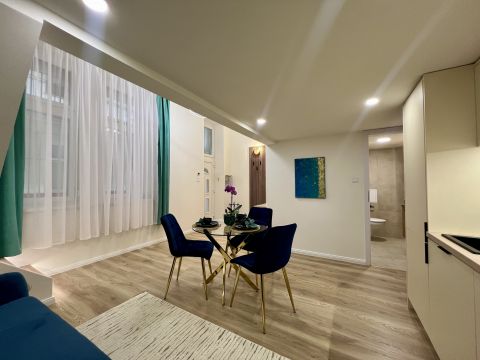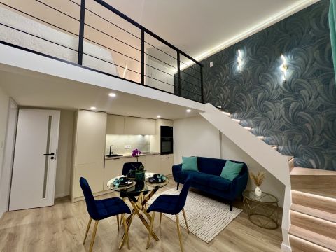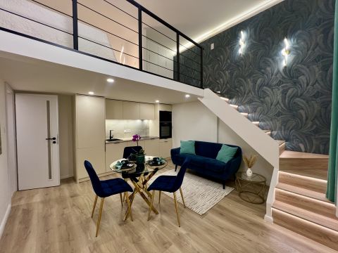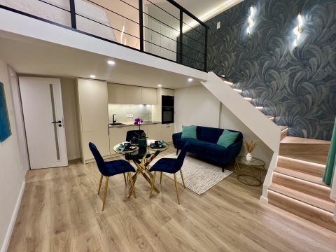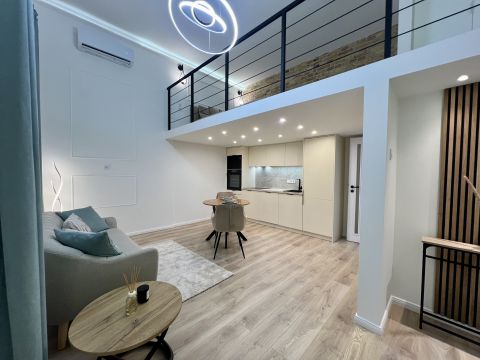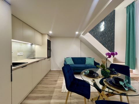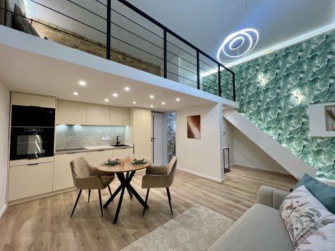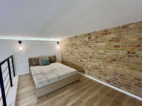 1 szoba + galéria kialakítású, teljes körűen felújított, modern berendezéssel. A galéria 185 cm magas, lent 207 cm a belmagasság, a teljes belmagasság 405 cm. A konyha teljesen gépesített, beépített mosogatógéppel, a komfortot pedig padlófűtés és klíma biztosítja.