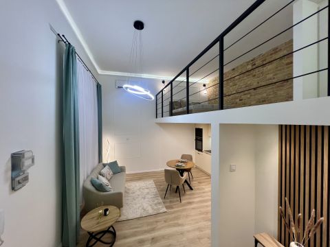 Szintén 1 szoba + galéria, teljes körűen felújított, új burkolatokkal, bútorokkal, gépesített konyhával, padlófűtéssel és klímával. A galéria 185 cm magas, lent itt is 207 cm a belmagasság.