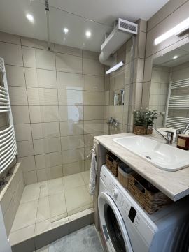 A lakás igényes, harmonikus színekkel, minőségi burkolatokkal lett felújítva.