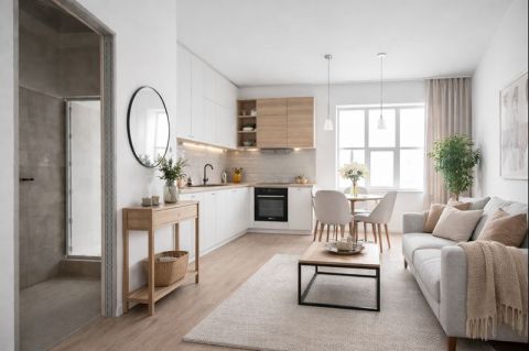 Nappali-konyha egy légtérben és fürdő wc-vel.