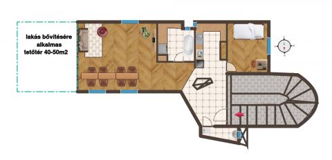 A lakás melletti tetőtér kb. 50 m² vásárolható meg, amelyre már elkészültek a tervek.